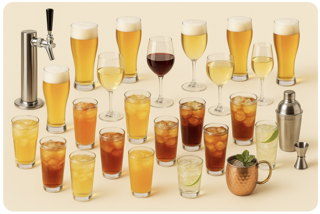 発泡酒を含むビール系ドリンクに加え、ハイボール・カクテル・ワイン・梅酒まで揃えた、バランスの良い飲み放題プラン